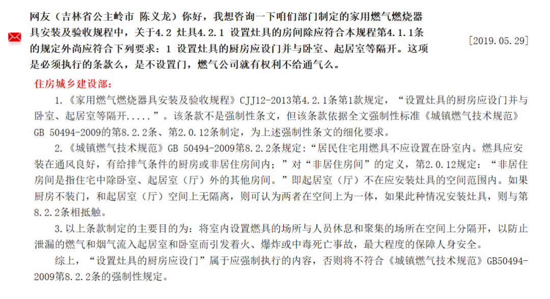 國(guó)家住建部燃?xì)鈽?biāo)準(zhǔn)化技術(shù)委員會(huì)在對(duì)上述條款的解釋中明確表示:“如果燃?xì)饩咴O(shè)置在與屬于起居室的客廳在空間上連成一體的廚房?jī)?nèi),則不符合上述條文的規(guī)定”。