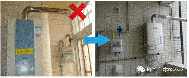 ④熱水器廢氣排放在室內(nèi);整改建議:加長煙管至室外。